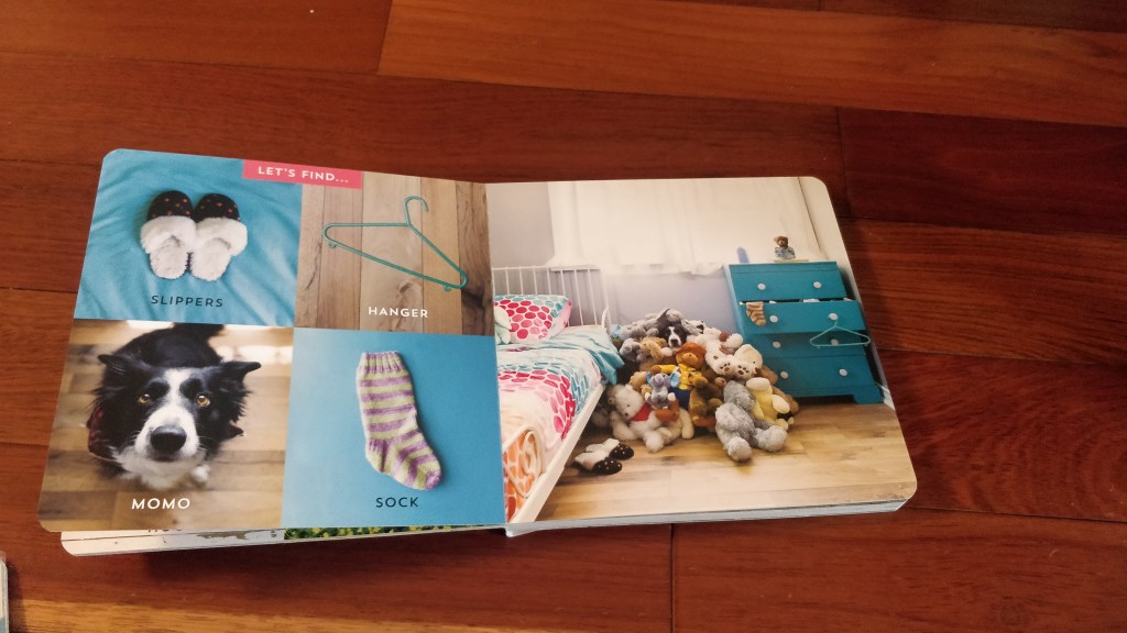 Улюблений песик Момо, що любить ховатися, і книжка з його пошуків.